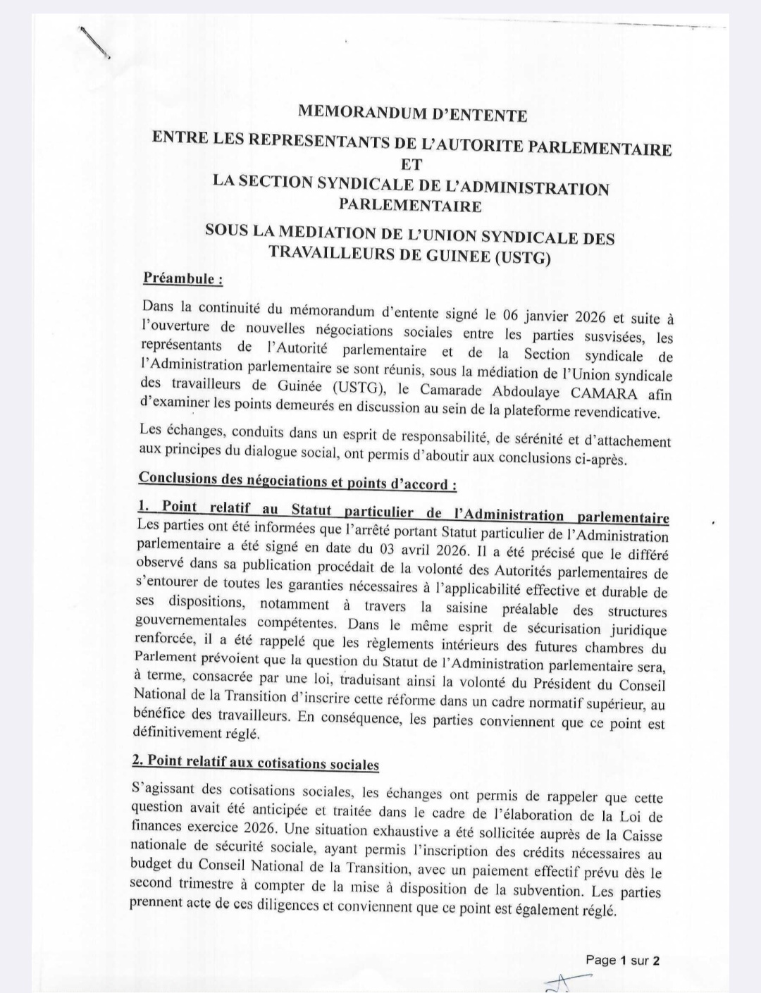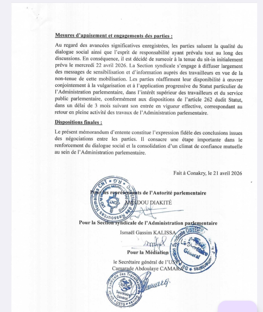 Le dialogue a finalement triomphé dans les couloirs du Conseil National de la Transition (CNT). Un mémorandum d’entente, signé le 21 avril 2026 sous l’égide de l’USTG, a permis de répondre point par point aux revendications des travailleurs et d’annuler la mobilisation prévue ce mercredi.