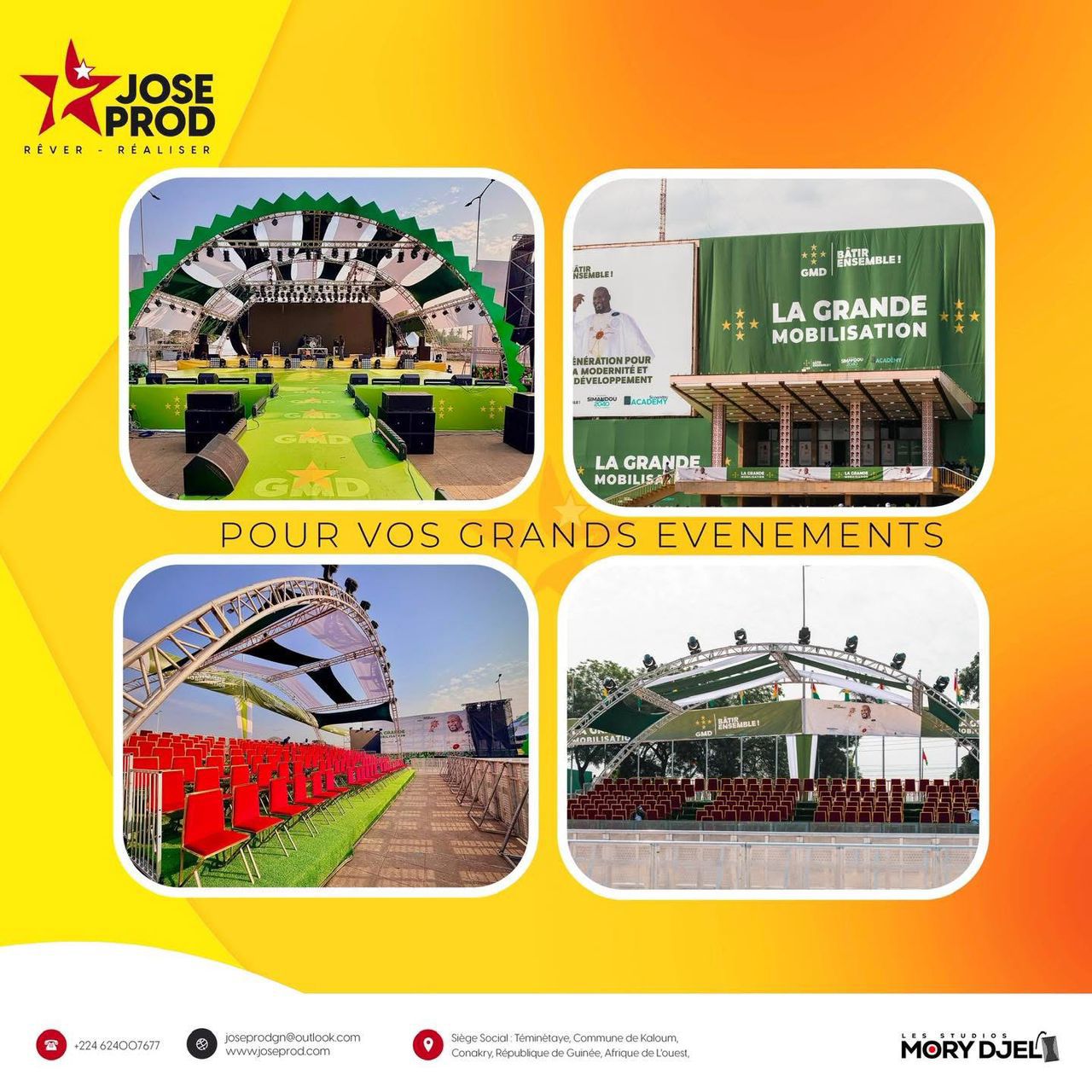 Avec une capacité logistique impressionnante chapiteaux mobiles de plus de 10 000 m², sonorisation de pointe, tribunes, écrans géants, éclairages et scénographies innovantes JOSEPROD s’impose aujourd’hui comme un acteur incontournable, générant des centaines d’emplois directs et indirects.